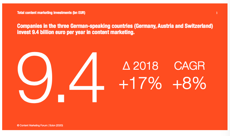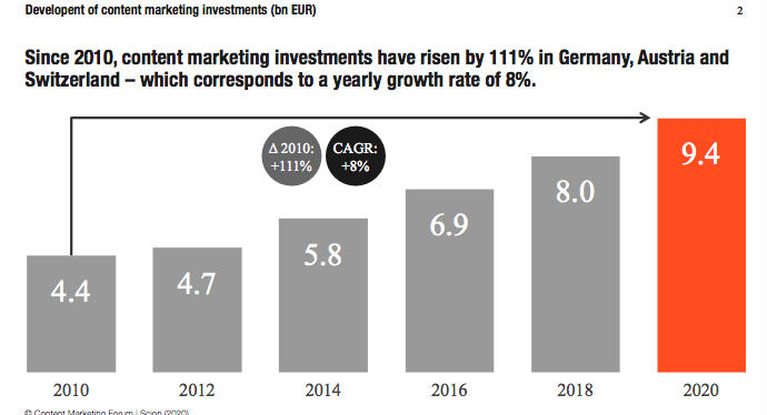 The market for content marketing in Germany, Austria and Switzerland reached a volume of 9.4 billion euros in 2020. An end to this growth was not in sight – if it hadn’t been for the Corona crisis.