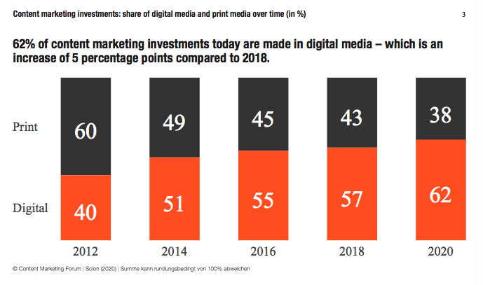 Investments in content marketing in the three German-speaking countries have increased by 17 percent since the last Content Marketing Base Study in 2018, and have thus doubled since 2012. A further ten percent increase in investment was expected annually over the next three years. At least that was the mood in the market before the beginning of the Corona crisis. The study data was collected in February this year by Professor Clemens Koob and his market research institute Scion in Munich. For the most important results, see the four attached charts: the growth of content marketing activities in Germany, Austria and Switzerland; the distribution of investments between digital media and print; and the importance of content marketing in the entire customer journey today.